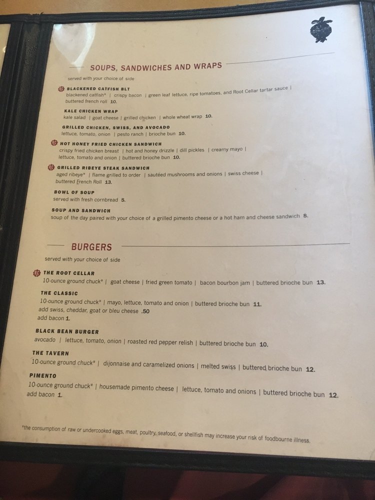 Lightly blackened catfish, crispy bacon, green leaf lettuce, ripe tomatoes, and Root Cellar tartar sauce. Served with your choice of side.